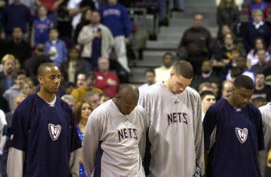 美國航天飛機(jī)哥倫比亞號(hào)于北京時(shí)間昨天晚間失事,機(jī)上全部7名宇航員全部罹難。圖為美國NBA比賽開始前,新澤西網(wǎng)隊(duì)隊(duì)員為遇難者進(jìn)行默哀。他們在今天比賽中的對手是底特律活塞隊(duì)。