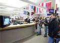 2月1日記者們在肯尼迪航天中心的新聞中心收聽最新消息