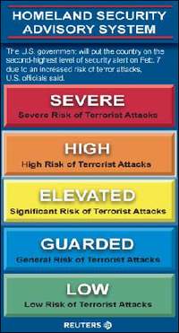 據(jù)悉,“9·11”恐怖襲擊事件發(fā)生后,美國建立了一套5級國家威脅預(yù)警系統(tǒng),用綠、藍、黃、橙、紅5色代表從低到高的5種危險程度。此后,美國長時間維持在黃色戒備狀態(tài),表明國家安全面臨著“相當(dāng)程度的威脅”。