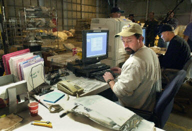 10日,美國洛杉機巴科斯德勒空軍基地,哥倫比亞號聯合調查組人員對收集來的殘骸進行分析比對,試圖找出哥倫比亞航天飛機失事的原因。