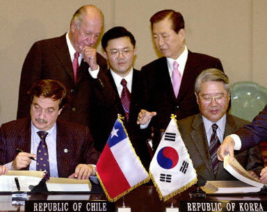 韓國和智利政府15日在漢城簽署了自由貿(mào)易協(xié)定,為擴(kuò)大兩國間的貿(mào)易創(chuàng)造條件。這是韓國與外國簽署的第一個自由貿(mào)易協(xié)定。