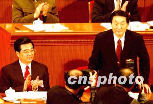 中國總理朱镕基三月五日向十屆全國人大一次會議作完《政府工作報告》后,面對代表們長時間的鼓掌起立致謝。作者:賈國榮