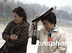 全國人大代表在六日參加十屆全國人大一次會議時正逢北京雨雪飄飛,在人民大會堂東門等候代表的記者全副武裝。作者:廖文靜