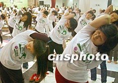 “白蘭氏”與香港各界婦女聯合協會,三月八日在香港舉行“百人紓壓瑜伽日”活動。圖為眾多女士練瑜伽功。錢興強 攝