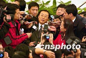 中國勞動和社會保障部部長張左己十二日在十屆全國人大舉行的中外記者招待會結束后,被眾多提問記者包圍。作者:張煒
