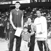 在14日晚火箭隊(duì)與公牛隊(duì)開賽之前,黃朱惠愛女士帶著她那也是“姚明小球迷”的孫子一道走向了姚明。她代表德州州長(zhǎng)培瑞和州政府及州議會(huì)向他頒發(fā)了祝賀狀,姚明十分高興地從這位當(dāng)?shù)刂娜A裔女議員手中接過(guò)了祝賀狀。