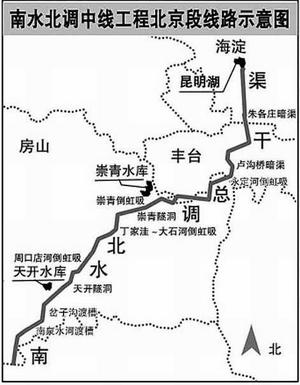 中線調水將由房山入京,過永定河,經京密引水渠到頤和園,使北京京南的房山、大興、豐臺以及門頭溝、通州等一向深受缺水困擾的地區得到緩解。同時,北京市重要的用水單位燕山石化、京西工業區、亦莊工業區等也將近水樓臺先得月。按照設計,沿線有11個自來水廠,多個分水口,屆時,京城以昆明湖的團城湖為結合點,將形成統一的環市區地表水供水網絡,加上原有的自來水供水系統,北京城區及其周圍衛星城鎮的供水保證率將大大提高。