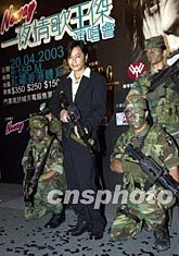 歌星王杰3月28日在香港出席「Neway 一夜情歌王杰演唱會」記者會。大會特別安排幾位身穿迷彩軍服手持步槍的臨時演員為宣傳演唱會增添氣氛。演唱會定于4月20日于紅館舉行。鄧慶樂 攝
