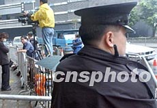 四月七日香港歌迷告別巨星張國榮追悼會將在香港殯儀館舉行,在殯儀館前警察加強警衛 。錢興強 攝