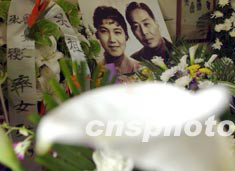 “這可能是五十年代末六十年代初媽媽演《花為媒》時期的合影。是他們生前最喜歡的合影之一。”吳老的愛女吳霜說。客廳的四壁還掛著很多新鳳霞各個時期的生活照和劇照以及兩老的合影。劉延東、胡德平、張鍥、李默然等人和文化部等單位都送來了花籃。很多客廳里擺不下的花籃只好擺到樓道里。吳霜說:“劉延東部長昨天勉勵我們說,你們的父母是杰出的藝術家,你們要繼承他們的事業,要像他們那樣做光明磊落的人。”“昨天來的人可太多了,很多都是七八十歲的老人,如丁聰、黃苗子夫婦等,有些走路都要別人攙著,來到靈前痛哭流涕。老爺子為人好,朋友多。”吳家的好友張盛春回憶說,昨天來的最高壽的就是黃苗子他老人家,今年九十了。