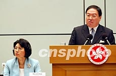 香港民政事務局局長何志平4月18日在政府總部表示,當局推動一系列清潔項目,鼓勵全民參與清潔家居、辦公室、學校和社區,以展示大家團結一致打擊SARS。洪少葵 攝