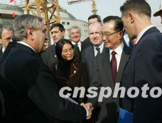 國務院總理溫家寶,二十五日在北京陪同法國總理拉法蘭(左二)參觀國家大劇院工地。作者:滿會喬