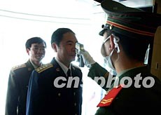 解放軍接管的北京小湯山野戰(zhàn)非典定點醫(yī)院五月一日封閉進(jìn)入臨戰(zhàn)狀態(tài),警衛(wèi)士兵對進(jìn)入?yún)?zhàn)的高級軍官嚴(yán)格檢查體溫。作者:賈國榮