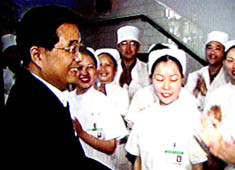 胡錦濤說,前一階段,廣大醫(yī)務(wù)工作者不辭辛勞,恪盡職守,做了大量卓有成效的工作,為防治“非典”做出了突出貢獻(xiàn),黨、政府和人民感謝你們。
