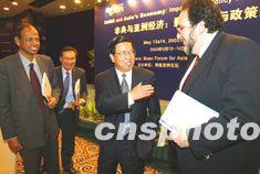 博鰲亞洲論壇SARS與亞洲經濟--影響評估與政策建議研討會十四日在北京結束,博鰲亞洲論壇秘書長龍永圖(右二)與出席會議的華爾街日報中國社長高賦文(右一)、馬來西亞駐華大使馬吉德等交談。中新社記者:毛建軍