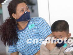 日前,在香港國際機場候機大廳,乘客依然戴妥口罩謹防“非典”。圖為戴口罩候機的母子。 中新社傳真 錢興強 攝