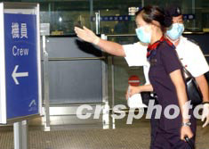 近日,香港“非典”疫情逐漸趨于穩定,香港機場管理局仍嚴格執行各項預防“非典”措施,所有機組人員需通過體溫探熱后方可登機。 中新社傳真 錢興強 攝