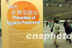 近日,香港“非典”疫情逐漸趨于穩定,香港機場管理局仍嚴格執行各項預防“非典”措施,圖為機場隨處可見醒目的預防“非典”標語。中新社傳真 錢興強 攝