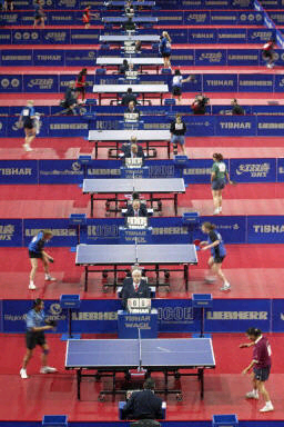 浪漫的法國人沒有在開幕式上展現(xiàn)他們的藝術(shù)細(xì)胞和想象力,剛承載了一天比賽的球臺依然端放在場地中央,成為最切合世乒賽主題的“道具”,以播音員播報和彩色大屏幕閃現(xiàn)參賽國名及國旗的方式省略了運動員入場儀式,使開幕式變得簡短而實在。但當(dāng)法國乒協(xié)主席韋爾唐在率先致辭后高呼:“法國萬歲!世乒賽萬歲!乒乓球萬歲!”時,沒有人不相信,充滿激情的法國人也將使這次大賽成為一次充滿激情的賽事。