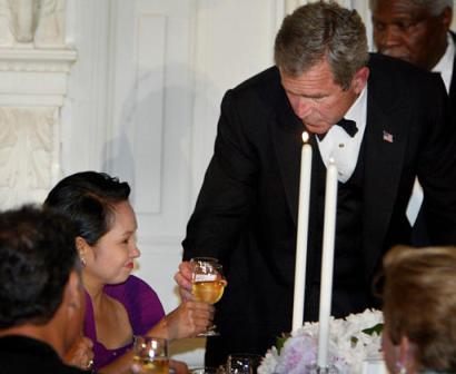 聽完布什總統(tǒng)的祝酒詞,阿羅約總統(tǒng)一飲而盡,并發(fā)表了她自己的祝酒詞,呼吁“進(jìn)一步擴(kuò)大這一正義的伙伴關(guān)系以完成志愿聯(lián)盟的更大任務(wù)。”