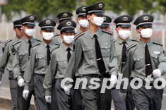 一群保安二十一日列隊走過北京街頭。盡管目前SARS疫情逐漸緩解,但有關(guān)方面提醒市民千萬不可麻痹大意、放松警惕。中新社記者:張煒