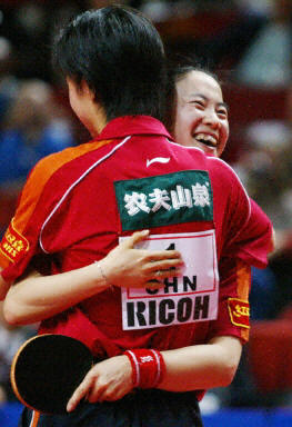 中新網(wǎng)5月25日電 象征世界女子乒壇雙打最高榮譽(yù)的波普杯,今天再一次刻上了中國人的名字。在第47屆使乒賽女雙決賽中,王楠/張怡寧技高一籌,4:1戰(zhàn)勝郭躍/牛劍峰,首次共同登頂世界最高領(lǐng)獎(jiǎng)臺(tái)。