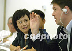 五月二十八日,由加拿大駐華大使館組織的中外記者突發事件經驗交流會在加拿大駐華大使館舉行,中外記者就SARS以及伊拉克戰爭報道交流經驗。圖為《財經》雜志主編胡舒立(中)和國外記者交流SARA報道經驗。中新社記者 盛佳鵬 攝