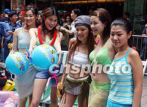 為刺激消費市道和營造復蘇氣氛,香港從六月八日起在灣仔駱克道舉行星光之夜活動。圖為數十名模特穿上泳裝在街頭巡游。潘索菲 攝