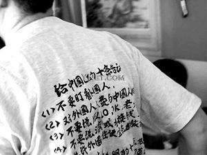 據(jù)《現(xiàn)代快報(bào)》報(bào)道,該外籍男子當(dāng)時(shí)身著一件后背印有字跡的T恤,上面寫著“給中國人十條告誡”,如“(1)不許盯看外國人,(2)不要跟外國人說HELLO、OK,(3)允許外國人住便宜旅館”等內(nèi)容。在場的兩位市民許先生和陳先生對(duì)“老外”T恤上的文字表示不滿,當(dāng)即上前讓其脫下該衣服,在場的其他市民也紛紛附和。