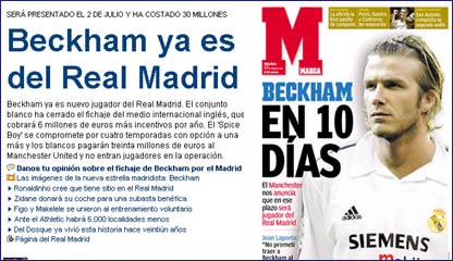 英國各電視臺今晚引述西班牙媒體的報導說,皇馬隊將于七月一日安排貝克漢姆作例行體檢,第二天將讓他在皇馬隊總部亮相,象征他加盟的開始。