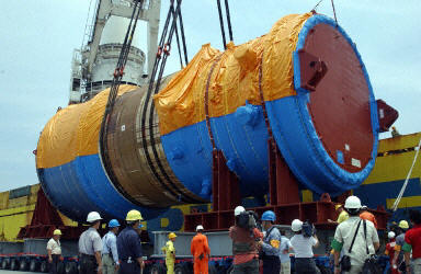 據“中央社”報道,“核四”反應爐壓力容器主體及配件共32件數日前運抵基隆港靠岸,原預定17日凌晨卸載,由于天公不作美、海象不佳,在港口等待數日。該反應爐重達107噸,長24米、寬9米、長10米,是個超級巨無霸,從日本運抵臺灣,只有荷蘭籍巴卡尼號全球唯一足夠噸位的重件船,可以載得動。