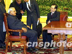中新社北京六月二十三日電 中國國務院總理溫家寶與印度總理瓦杰帕伊二十三日晚在北京人民大會堂共同簽署了《中華人民共和國和印度共和國關系原則和全面合作的宣言》。