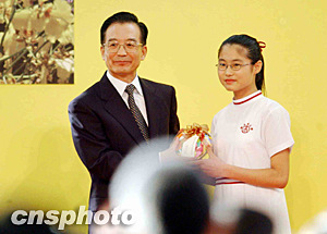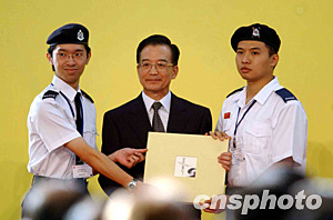 國務院總理溫家寶6月30日香港表揚醫護人員成功克服SARS聚會上,接受香港學生贈送紀念品。洪少葵 攝