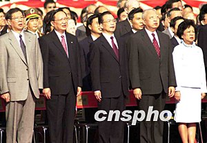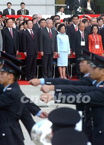 香港灣仔金紫荊廣場今早舉行升旗儀式。當國務院總理溫家寶在特區行政長官董建華陪同下步入廣場時,全場響起熱烈的掌聲。升旗儀式有三千名嘉賓參加,由香港警察銀樂隊奏樂。