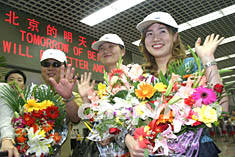 下午二時左右,當六十名韓國游客走進候機大廳時,早已在這里守候的歡迎人群立刻沸騰了起來。身著節日盛裝的姑娘們向來賓獻上鮮花和紀念品,歡迎來自韓國的勇敢的客人。
