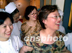 中新社廣州七月二日電 (記者王華)廣東省最后三名非典病人今天上午全部康復(fù)出院,患者與醫(yī)護(hù)人員相互擁抱慶賀。廣東省副省長(zhǎng)雷于藍(lán)等有關(guān)負(fù)責(zé)人參加了歡送會(huì)。