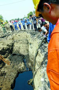12時許,經過緊張挖掘,維修人員在地面以下3米的“穿路套管”處,發現泄漏出來的原油,記者看到這里油如泉涌。據現場的技術人員介紹,從現場情況看來,泄漏情況比較嚴重,必須把這段長約24米的“穿路套管”打開后才能進行維修。