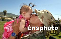 7月2日,一些駐伊美軍士兵的家屬在美國加州潘德爾頓美軍基地,歡迎他們從伊拉克歸國的親人。圖為一名歸來的美軍士兵熱烈親吻他6個月大的女兒。Ic/cnsphoto 攝