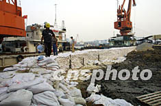 另一邊,在靠近黃浦江邊的施工現場,又在加緊加固倒塌的堤壩。安裝在船上的吊車正從臨江的水面上探入堤內,把長達十幾米的鐵制樁打入防汛墻周邊。據現場施工人員介紹,完成加固堤岸需要三百根這樣的鐵樁。