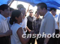 七月五日,國務院副總理回良玉來到安徽阜陽王家壩,看望安全轉(zhuǎn)移到大堤上的受災群眾.中新社記者:盛佳鵬