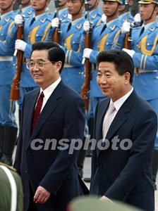 胡錦濤說,中韓在朝核問題上的立場有許多共同點,在爭取和平解決朝核問題的過程中,中韓有必要加強相互協(xié)調(diào)與溝通,發(fā)揮各自的影響,使北京會談開始的對話進程繼續(xù)下去。