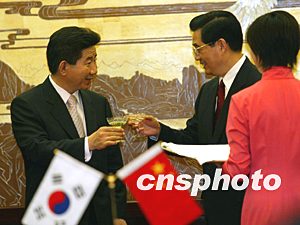會談前,胡錦濤在人民大會堂東門外廣場為盧武鉉訪華舉行了歡迎儀式。會談后,兩國元首出席了《中國工程院和韓國工程院工程科技合作諒解備忘錄》等三個文件的簽字儀式,并共同會見了中外記者。