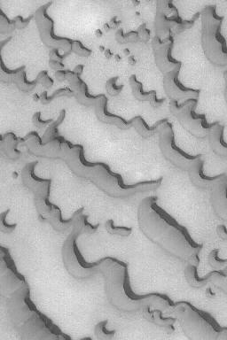 7月13日,來自美國國家航空和宇航局(NASA)的火星全球測量員(MGS)和火星衛星照相機(MOC)的圖片顯示,火星北極冰冠附近的沙丘。冰冠被大片受風吹蝕的黑暗沙丘包圍。