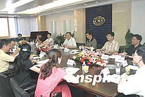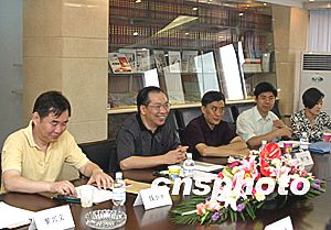 中國國務院新聞辦公室副主任王國慶(左二)一行七月十六日上午到中國新聞社考察工作。中新社記者:史利