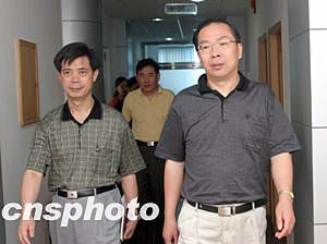 七月十六日上午,中國國務院僑辦副主任、中國新聞社社長劉澤彭(左)7月16日上午歡迎國務院新聞辦副主任王國慶(右)到中新社考察工作。中新社記者:史利