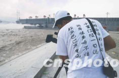 臺灣東森電視臺、中天電視等九家臺灣媒體,和中國新聞社、人民日報等八家著名媒體組成的海峽兩岸聯合采訪團共二十五名記者,七月中旬來到三峽工地進行聯合采訪。圖為臺灣電視攝像記者在三峽工地拍攝。作者:孫榮剛