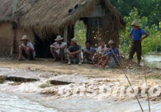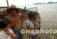 七月中旬的淮河洪水迫使安徽省穎上縣多處行洪區緊急破堤行洪,許多百姓被困在滔滔洪水中的高臺地帶,救濟成為當務之急。圖為洪水圍困邱家湖行洪區堤上的農民。中新社記者:賈國榮
