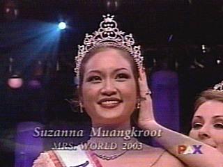 來自全球39位佳麗齊聚美國拉斯維加斯,為爭取2003年世界太太的桂冠使出混身解數。來自泰國的蘇珊娜在機智問答中,以沉著穩重的氣度舒展大將之風,她被問到的題目是為什么希望成為世界太太。她回答:“因為我知道戴上了皇冠就付予我舒展現代女子的能力,無論在泰國、美國、或任何地方,舒展出我們高貴有教養,有能力,并舒展我們很愛家人的道德!背藱C智問答贏得評審注意,蘇珊娜在才藝表演中,以烹調色香味俱全的泰國料理吸引評審。最后她在38名佳麗中脫穎而出,戴上桂冠。
