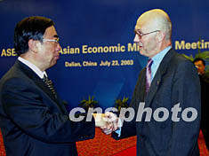 中新網(wǎng)7月24日電 商務(wù)部網(wǎng)站消息,第五屆亞歐經(jīng)濟部長會議主席、中國商務(wù)部部長呂福源23日晚在大連與率團前來出席會議的歐盟委員會貿(mào)易委員拉米就世界貿(mào)易組織新一輪多邊貿(mào)易談判的有關(guān)議題深入交換了意見。