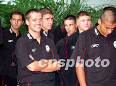 英超勁旅利物浦25日下午抵達香港,隊中奧云(前左)成為全場焦點。作者:蕭紓昊